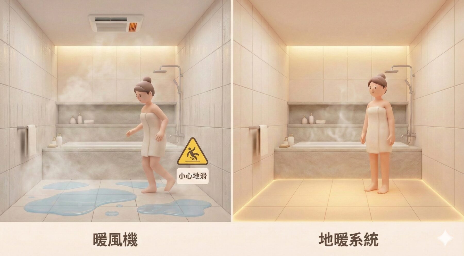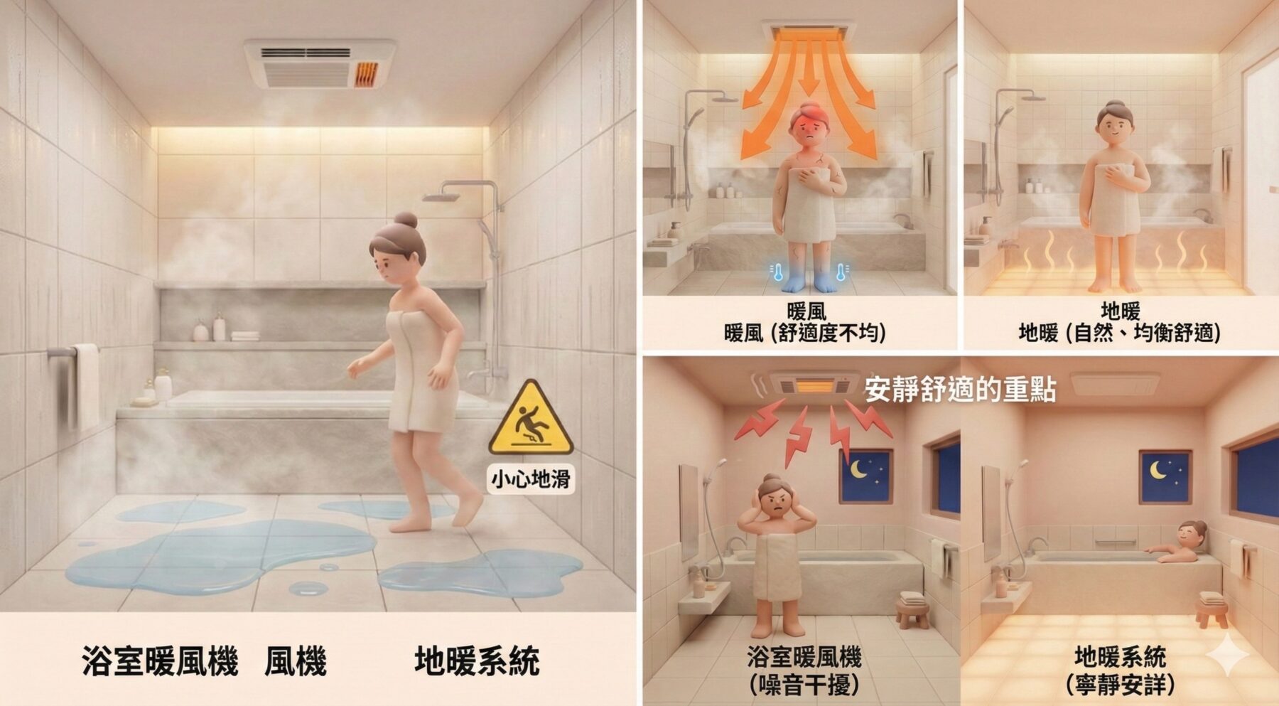 四、地暖 vs 浴室暖風機比較:保持地板乾燥,不易滑倒(這點很多人忽略)