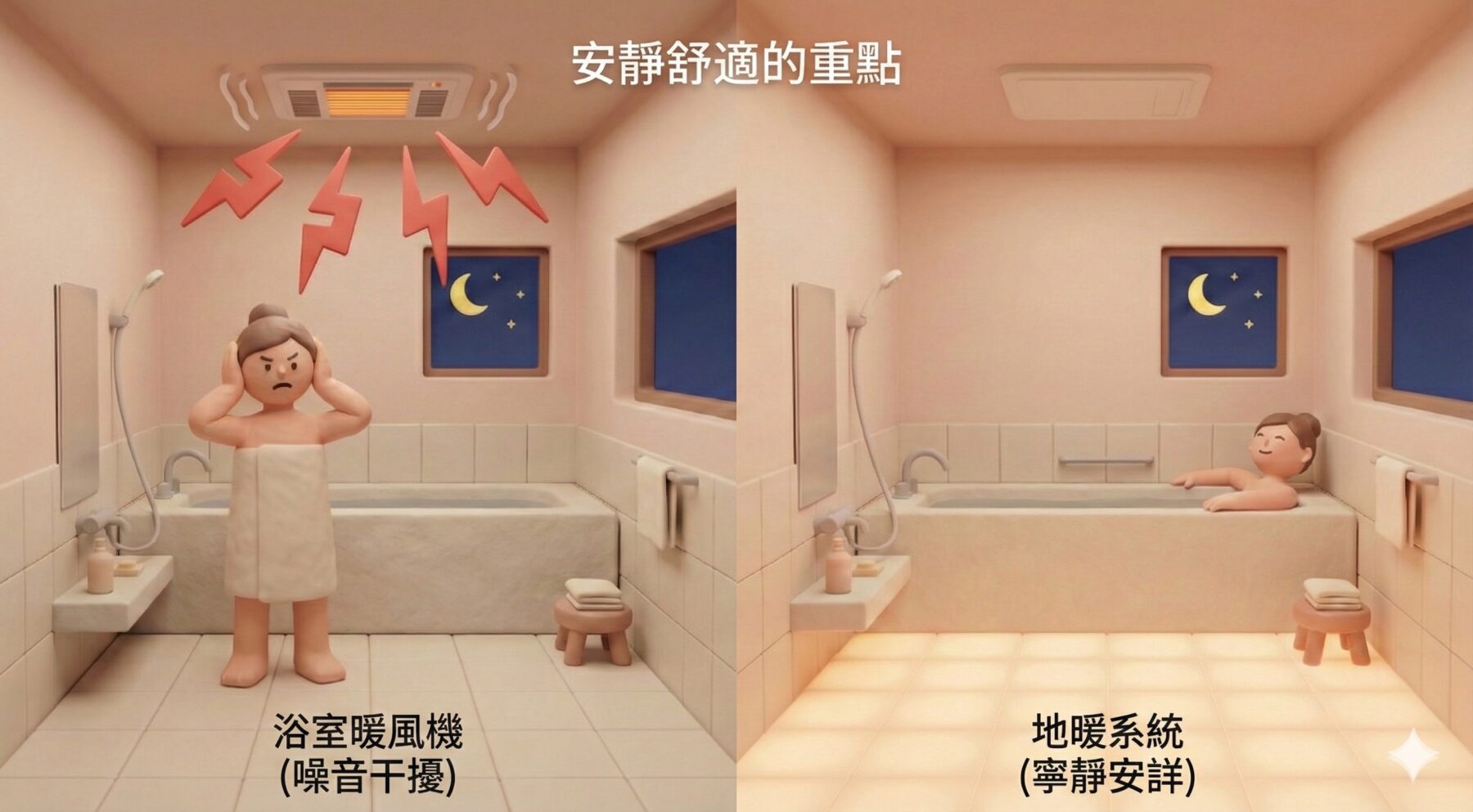 三、地暖 vs 浴室暖風機比較:更安靜,沒有風噪與馬達聲