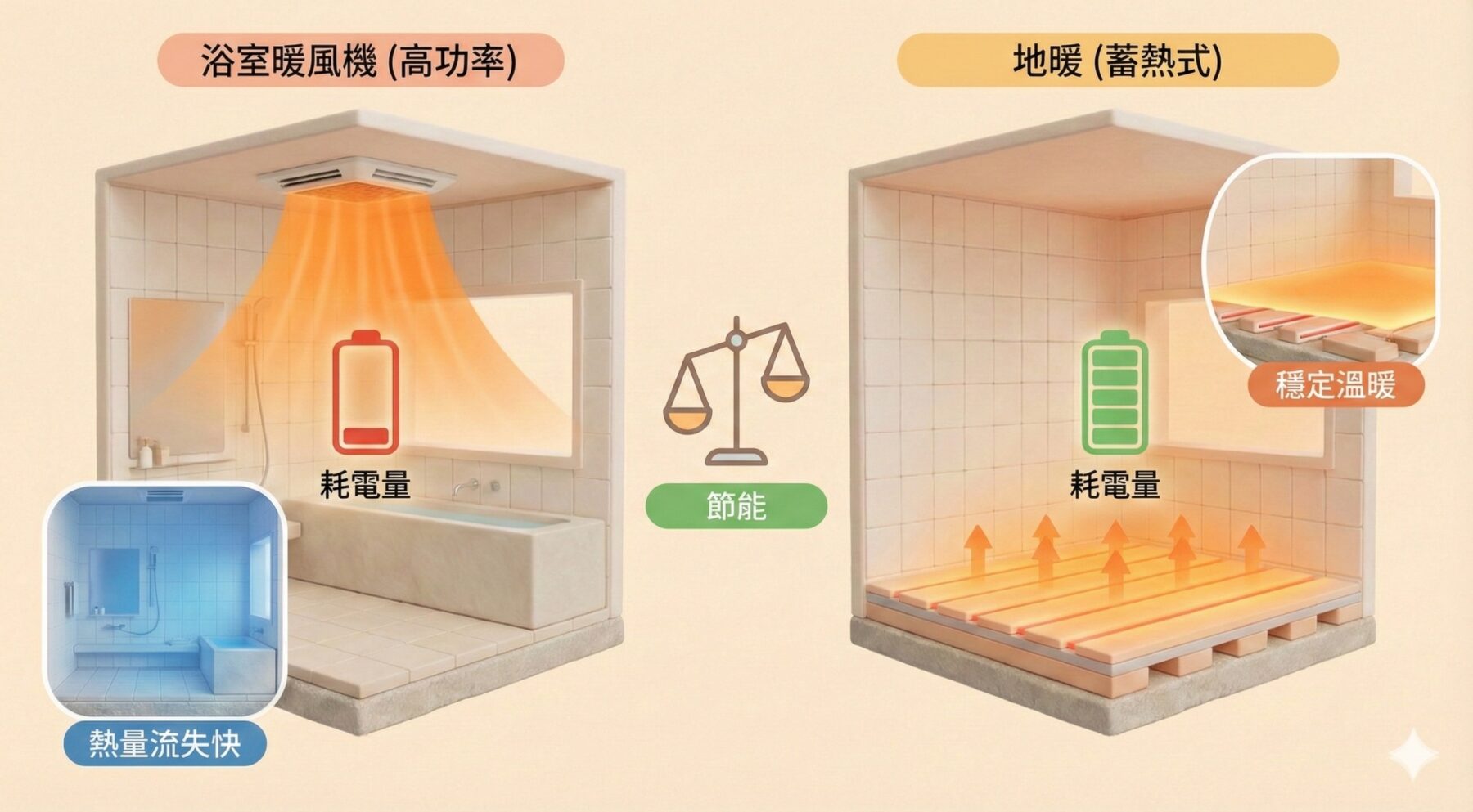 六、地暖 vs 浴室暖風機比較:更省電關鍵不是功率大小,而是「用熱效率」