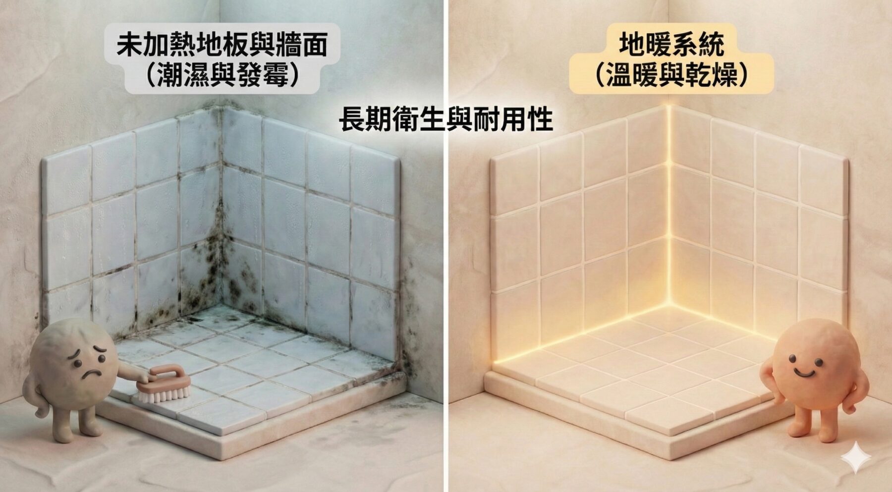 黑黴最容易生長的環境條件,正是潮濕、低溫與通風不良,而浴室幾乎完全符合這三個條件。使用暖風機時,只要一關機,空氣溫度往往會快速下降,但地板與牆角卻常常長時間維持在濕冷狀態,反而更適合黴菌滋生。地暖的長期優勢在於,地板能維持微溫狀態,濕氣不容易停留或凝結,黴菌的生長條件自然被破壞。不少實際使用過地暖浴室的家庭都會發現,磁磚縫隙與牆角真的比較不容易發黑,清潔負擔降低,浴室整體的耐用度與視覺品質也隨之提升。