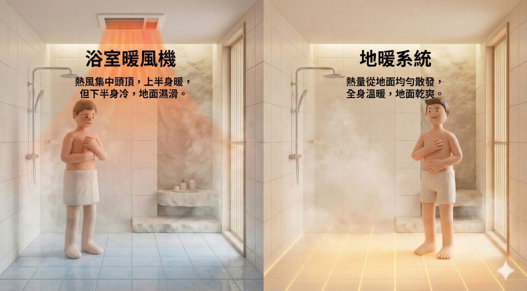 一、地暖 vs 浴室暖風機比較:洗澡時最冷的,其實是「腳底與牆面」,不是空氣