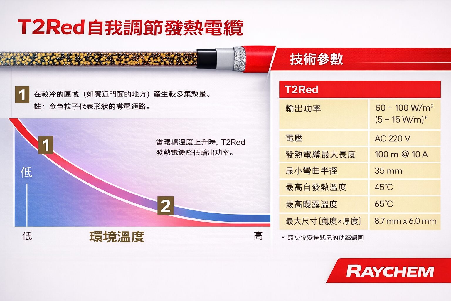 與一般恆功率電纜最大的差異在於,它並非持續輸出固定功率,而是會隨著溫度變化,自行調整輸出。
