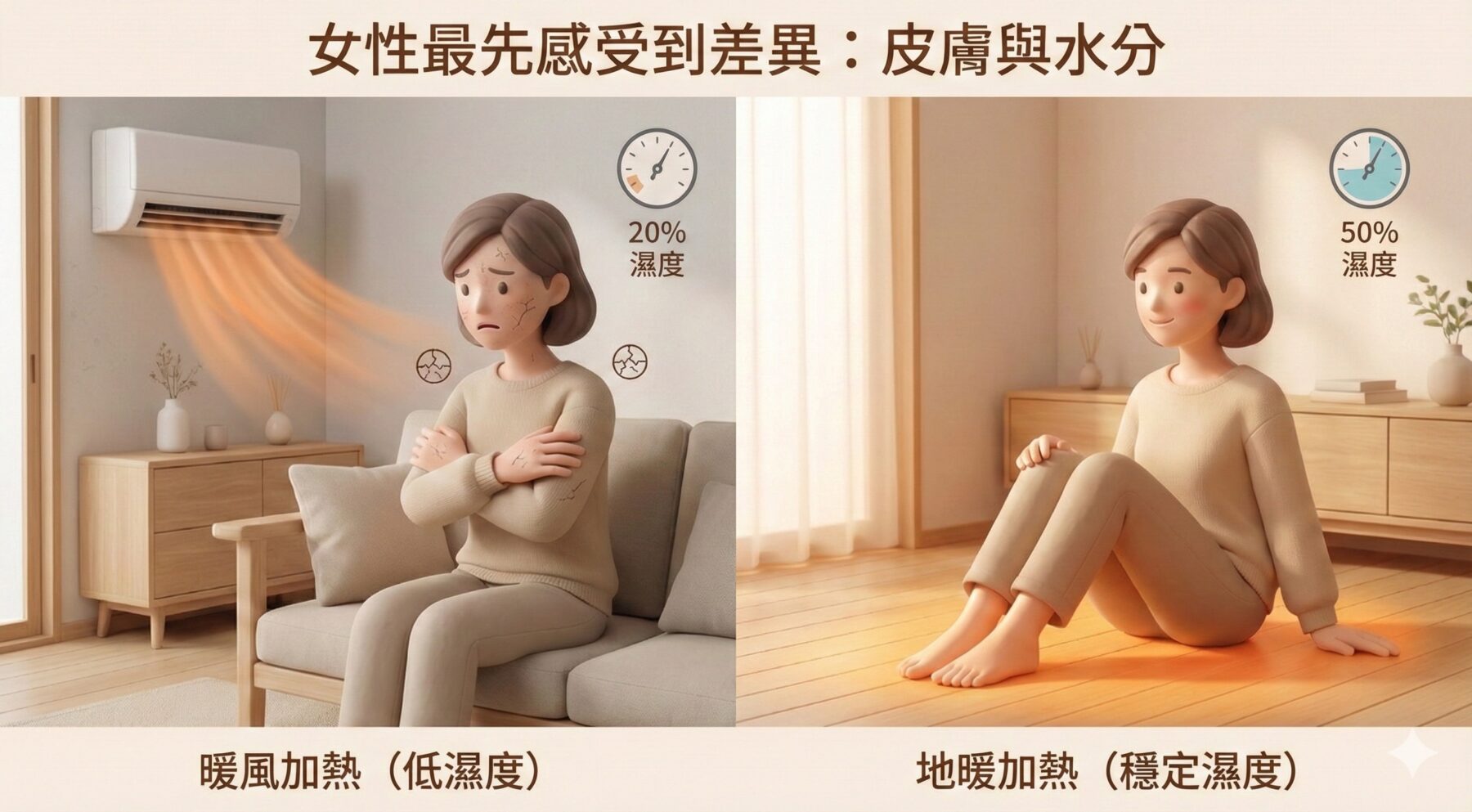 在高濕冷環境中,許多女性冬天真正困擾的,其實不是冷,而是保濕失衡。暖氣機一開,濕度快速下降,皮膚水分流失,乾癢與緊繃感會變得特別明顯。地暖幾乎沒有空氣擾動,室內濕度變化緩慢而穩定,皮膚不會一直被熱風吹乾。不少使用者分享,冬天的保養程序變得簡單了,甚至連乳液的用量都明顯減少。