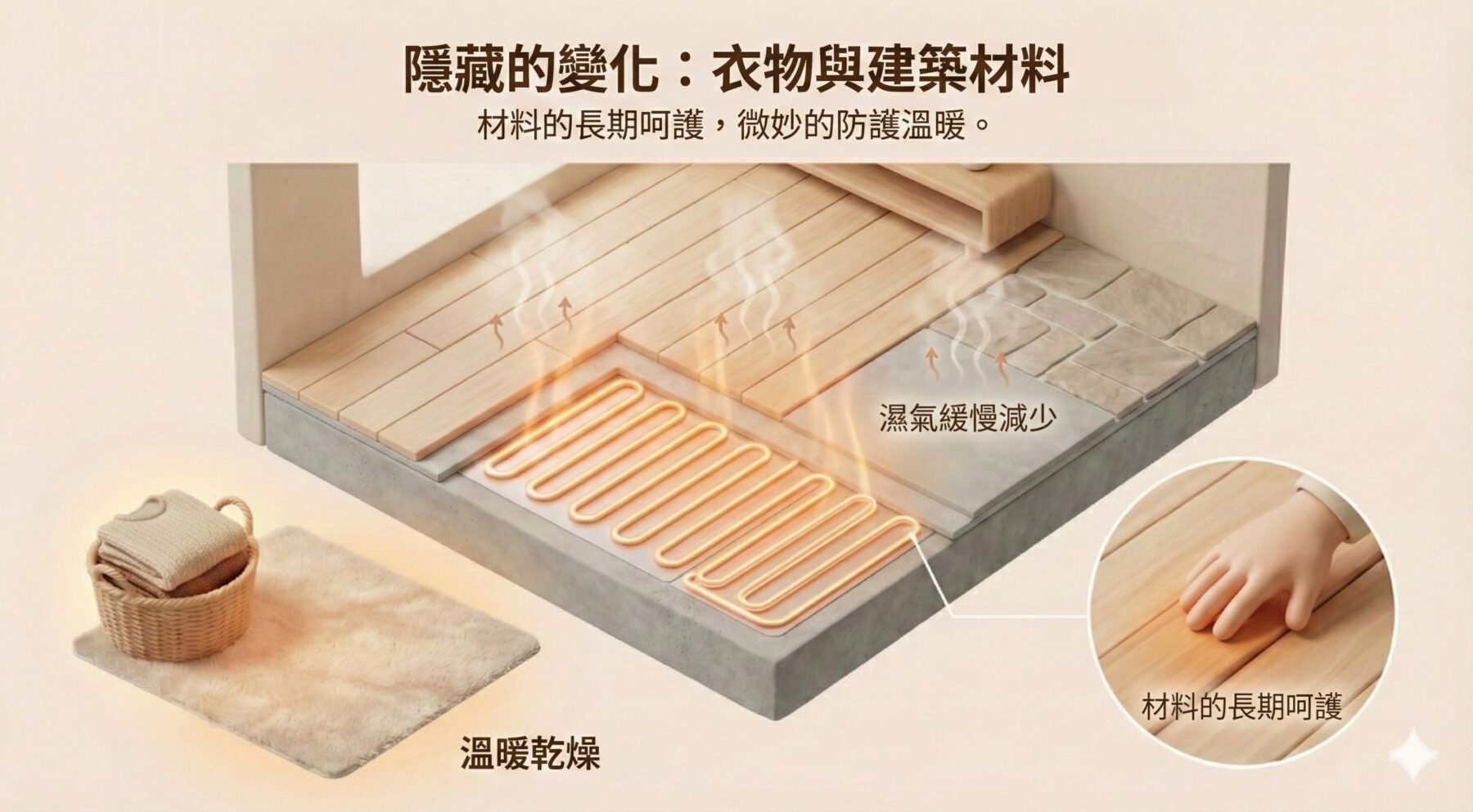 最後一個改變,往往最不在預期之中。當冬天地板不再潮濕,溫暖持續作用在木地板、大理石與水泥層上,整體結構會保持在相對乾燥的狀態,對建材本身也是一種長期的呵護。更衣室的地面變得乾爽,襪子與外套自然回溫、除濕,不是刻意烘乾,而是一種被溫柔照顧過的乾爽感。這正是地暖的輻射熱,長時間、緩慢作用在空間每個角落的結果。
